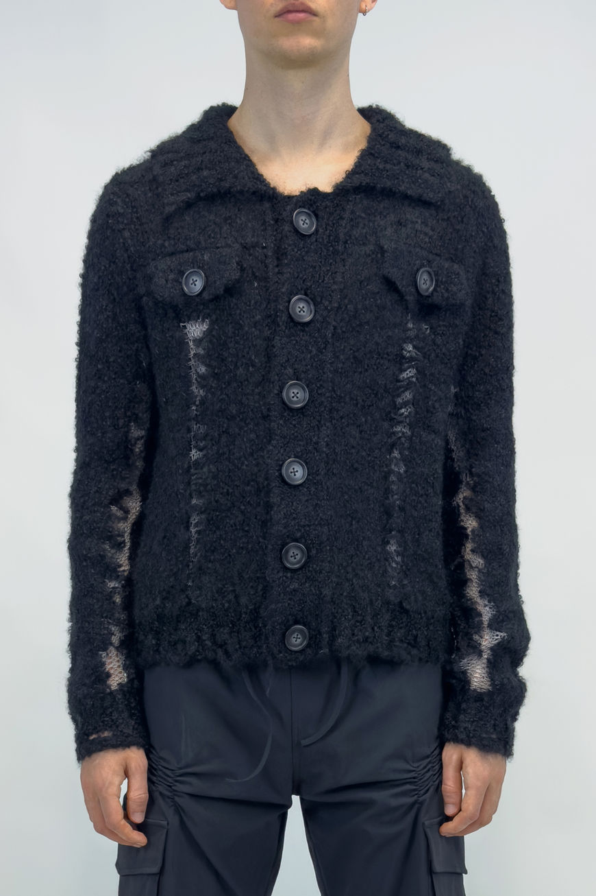 The “CASE” knitted denim-style jacket features a mohair knitted structure with distressed and open knit details throughout. It features two pocket flap details with an oversized relaxed fit.